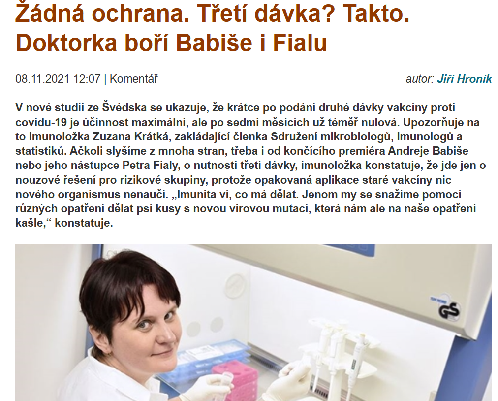Náš spor s Českou televizí začal v prosinci 2021. V šokující reportáži uvedené v pořadu Newsroom ze mne, zkušené imunoložky, udělala redaktorka během minuty „šiřitelku nebezpečných výmyslů“ a představitelku antivaxerské a dezinformační scény. Chyběla mi jen aluminiová čepička a magnet na rameni. Mohl za to můj rozhovor o vakcinaci publikovaný v Parlamentních listech a zveřejněný na webu Zdravého fóra, ve kterém jsem už tehdy předpověděla, že možná ani tři dávky mRNA nebudou chránit před covidem. Chápu, že se redaktorka, pokud ten rozhovor vůbec dočetla, notně vyděsila.