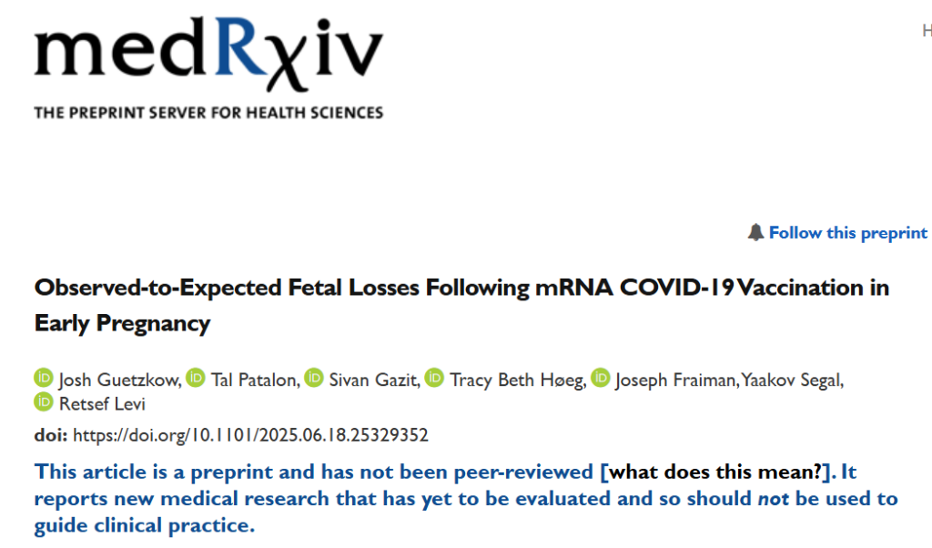 Lékařský establishment po celém západním světě očkování experimentální genetickou vakcínou během těhotenství doporučoval, aniž by měl evidenci z randomizovaných studií o účinnosti a bezpečnosti těchto preparátů. Zřejmě si tito „na slovo vzatí odborníci“ prostě troufli tipnout, že genetické vakcíny těhotným neuškodí. Dle výše citované analýzy ovšem uškodily, a to dosti podstatně.